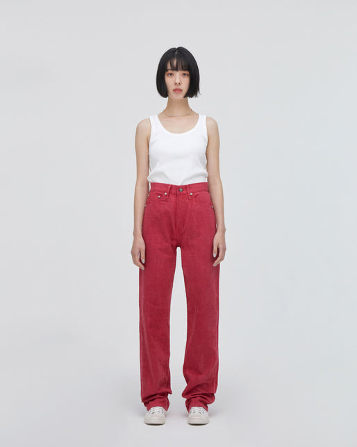 2回繰り返し染めることで、鮮やかな濃い赤色を作りました。天然染色ならではの陰影は優しく、合わせやすいデニムです。普段カラーを身に付けない方にも抵抗なく着用いただけます。