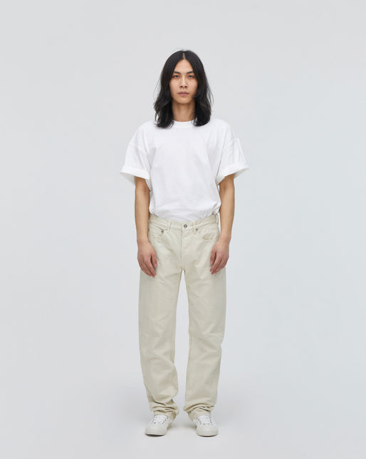 「裏葉」とは平安時代の色の例えで、葉の裏まで色彩に使う日本人の美意識に感銘を受けました。葉の裏側のような薄い緑色を帯びた白色です。真っ白ではないので、合わせやすいデニムです。